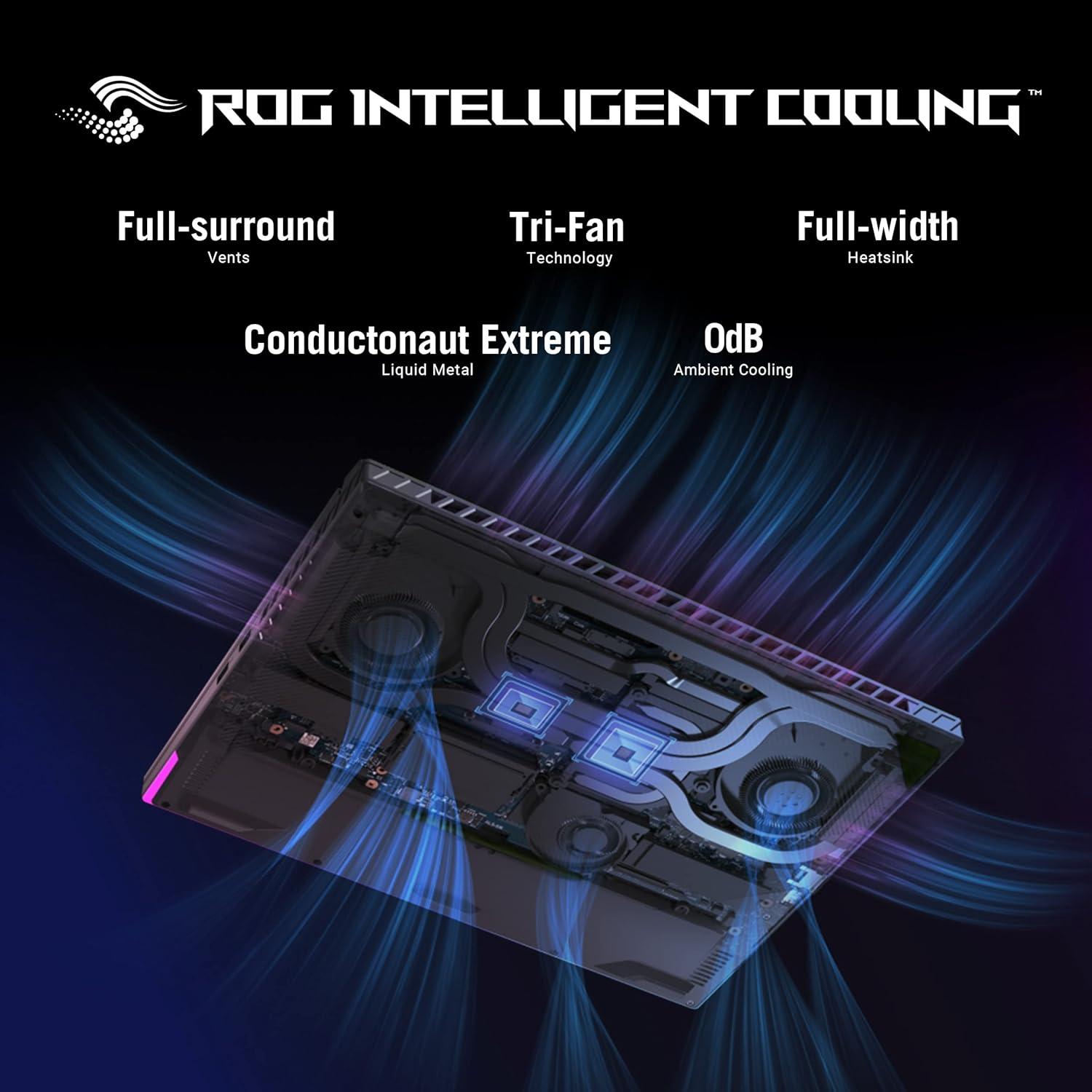 ROG INTELLIGENT COOLING – The Strix G16 features Thermal Grizzly’s Conductonaut Extreme liquid metal on the CPU, and a third intake fan among other premium features, to allow for better sustained performance over long gaming sessions.