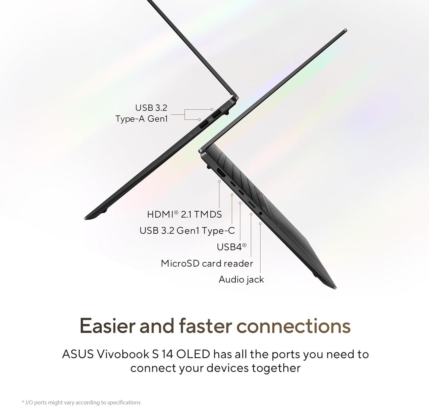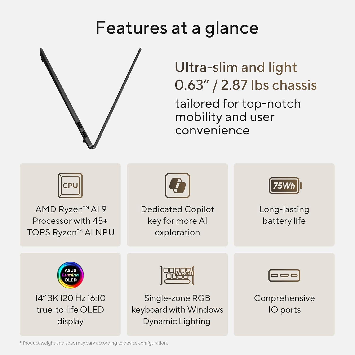STUNNING, SMOOTH VISUALS — 14” 3K (2880 x 1800) 120Hz ASUS Lumina OLED display delivers extremely smooth and vivid visuals, with a taller 16:10 aspect ratio that allows you to see more. The OLED display offers an ultrafast 0.2ms response time, up to 600nits peak HDR brightness, and 100% DCI-P3 color gamut