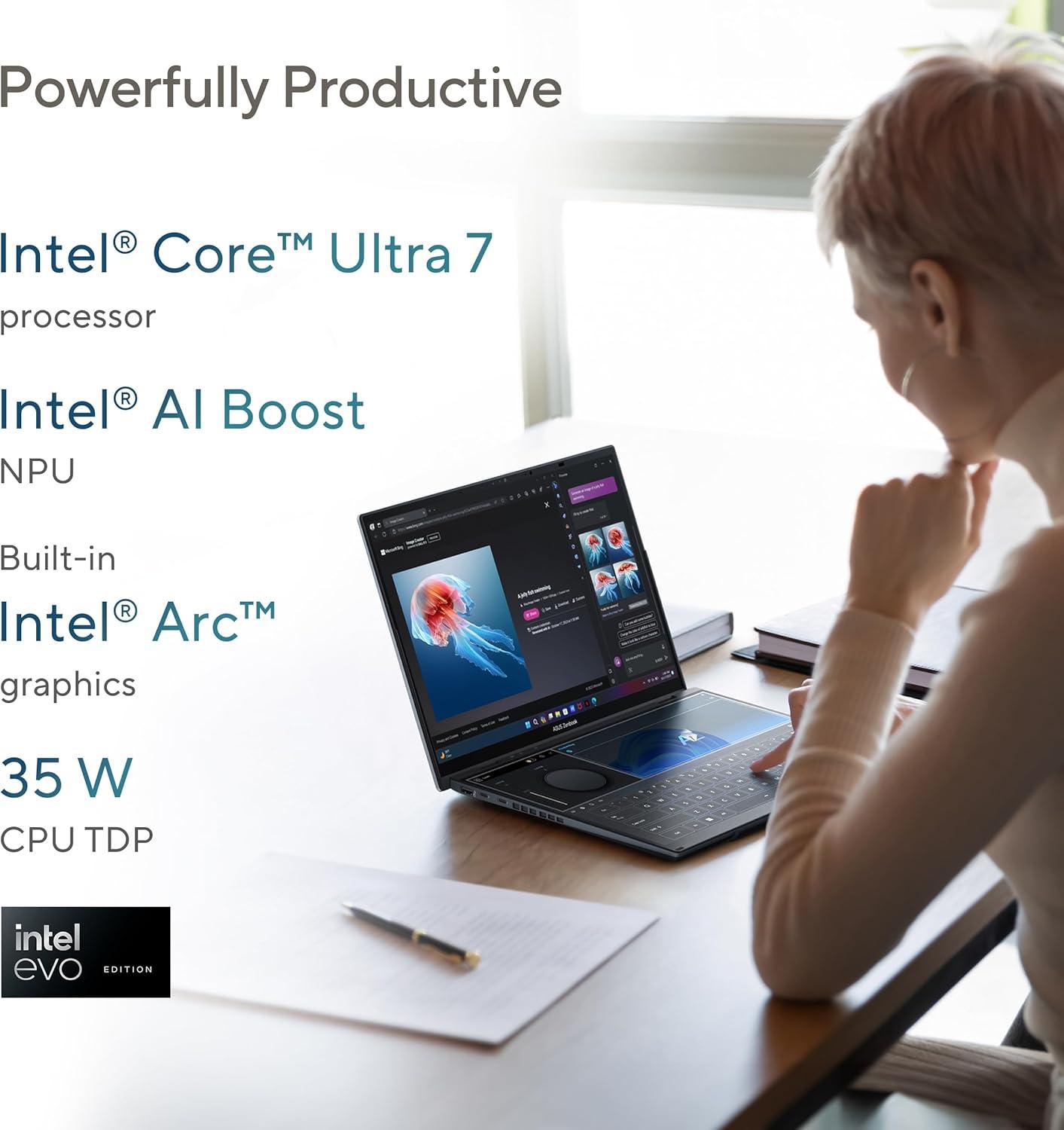 Powerfully productive – The Zenbook DUO delivers powerful performance and AI-ready features on Windows 11. The ultra-fast Intel Core Ultra 7-155H processor, paired with Intel Arc graphics, enhances tasks with AI capabilities. With 1TB SSD storage and 16GB LPDDR5x RAM, you can explore more seamlessly.