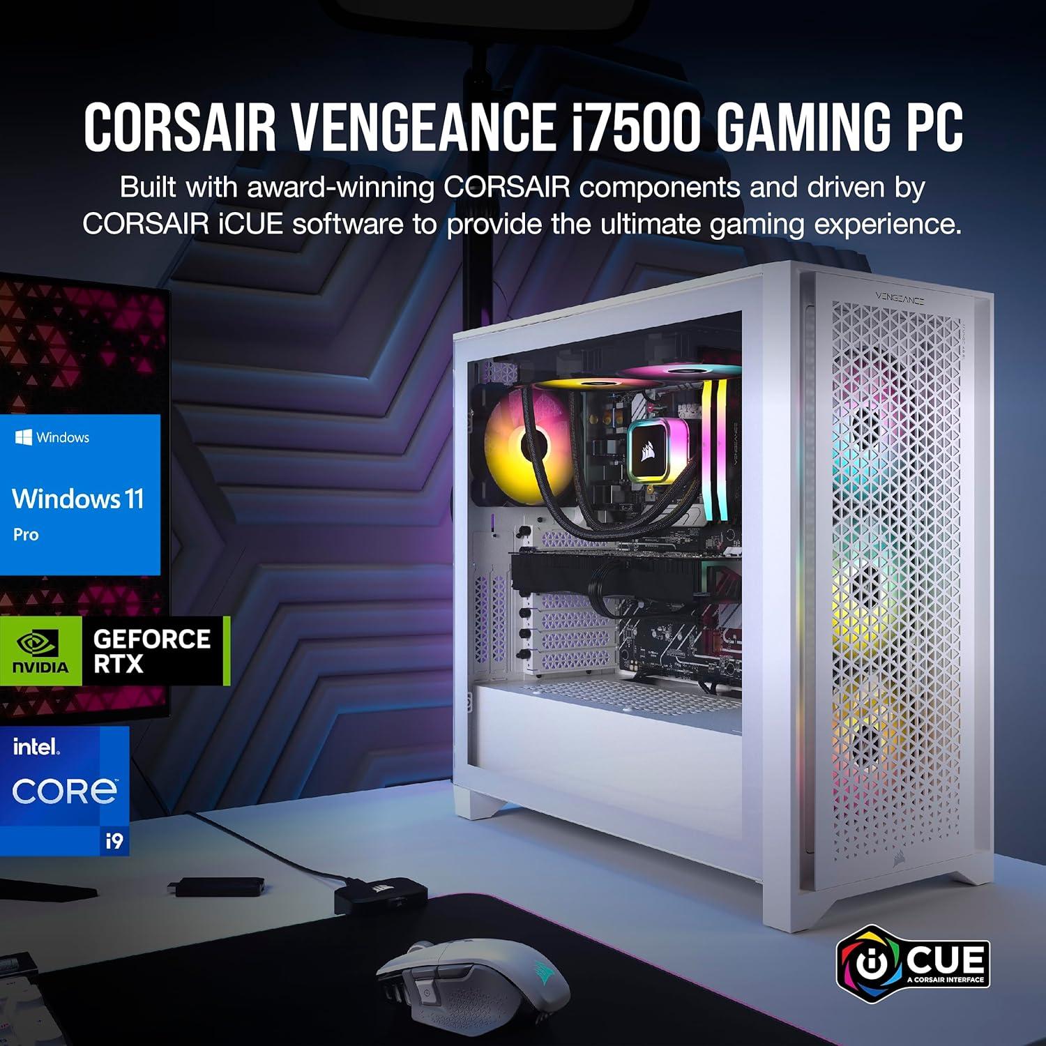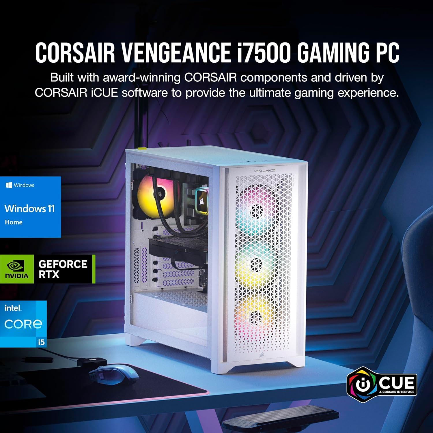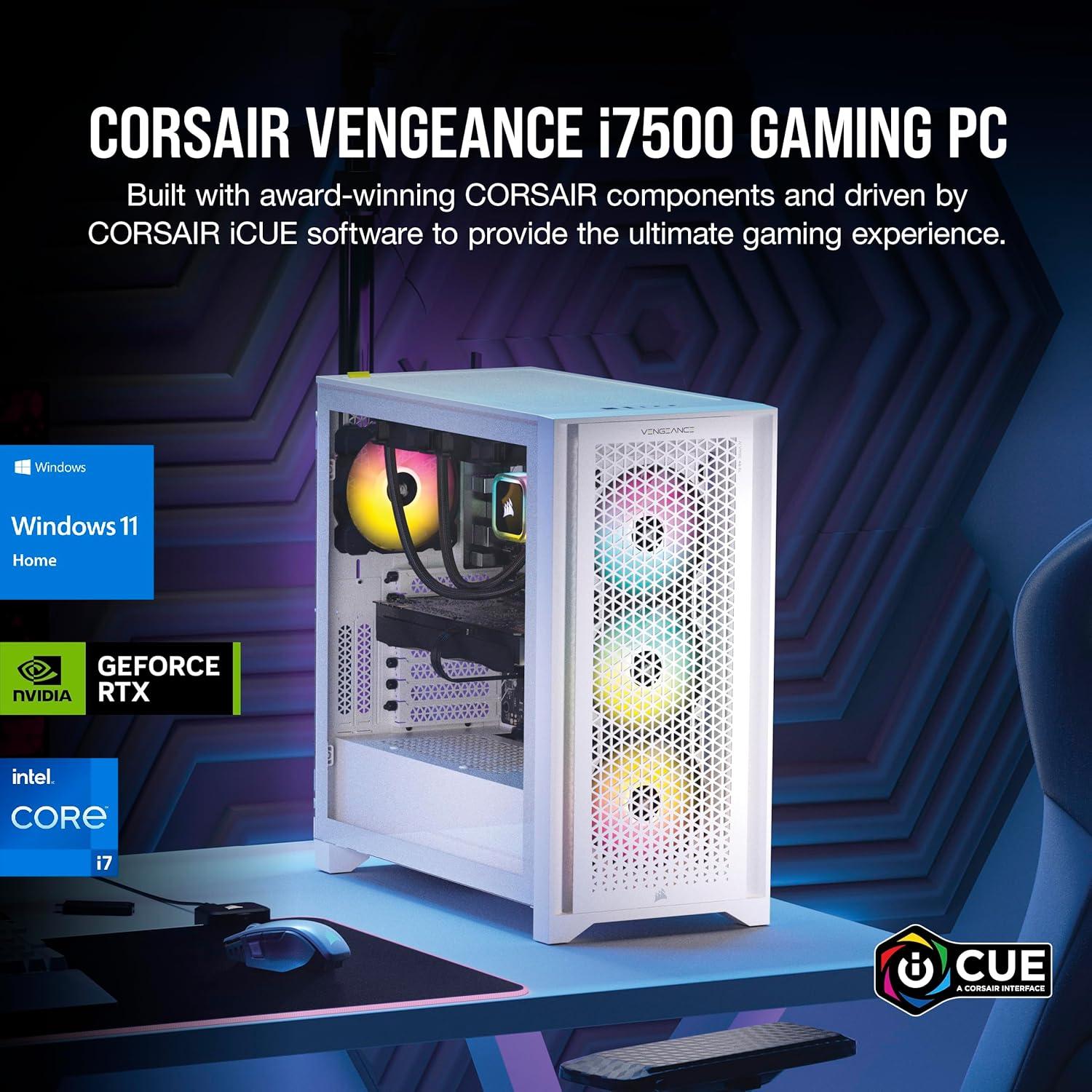 Step up your game with the CORSAIR VENGEANCE i7500 Series Gaming PC, powered by a 14th Gen Intel® Core™ processor, GeForce RTX™ 50 Series graphics, and CORSAIR VENGEANCE RGB DDR5 Memory. Built into the 3500X ARGB Mid-Tower Case, it offers stunning views of your PC’s internals through wraparound tempered glass panels, along with impressive cooling performance from side, rear, and roof fans. The VENGEANCE i7500 Series is cooled by an CORSAIR NAUTILUS RS ARGB Liquid CPU Cooler and six RS120 ARGB Fans with AirGuide technology for concentrated airflow. Equipped with a high-speed M.2 NVMe SSD and easily upgradeable, thanks to a standard ATX form factor.