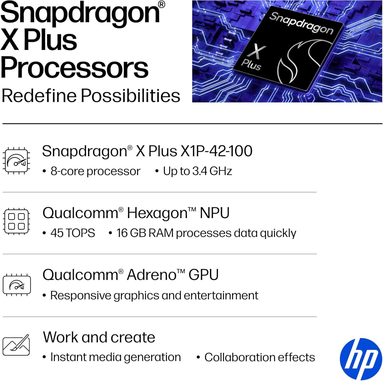 The HP OmniBook 5 16 inch AI PC, with the responsive Snapdragon X Plus processor, delivers AI-driven performance and an incredible battery life, so you can go all day and leave the charger behind. Your personal on-device assistant, HP AI Companion, helps streamline your workflow—no subscription required. The extensive battery life is engineered for efficiency, even with heavy multitasking and intensive workloads. Powered by Snapdragon X Plus and the dedicated AI engine that boosts speed and efficiency, you'll experience advanced computing performance in an ultra-thin profile that's designed for an easy on-the-go lifestyle. Enjoy an expansive audio-visual experience. The generous 16-inch 2K OLED touch display brings rich colors and deep contrast to every frame. Dual speakers with HP Audio Boost deliver immersive, high-quality sound, and the 1080p FHD IR camera ensures you always look your best on video calls. The HP OmniBook 5 Next Gen AI PC comes with a 65 W USB Type-C power adapter and goes from 0 to 50% charge in 30 minutes. Plus, it contains recycled materials and is built with ocean-bound plastic in bezel and speaker enclosures; recycled metal in top cover, base and keyboard support; post-consumer recycled plastic in keyboard keycaps and scissors. HP is here to help. This HP computer comes with 1-year limited hardware warranty and 1-year limited technical support for software and initial setup with 24-hour, 7 days a week web support when shipped from and sold by Amazon.com.