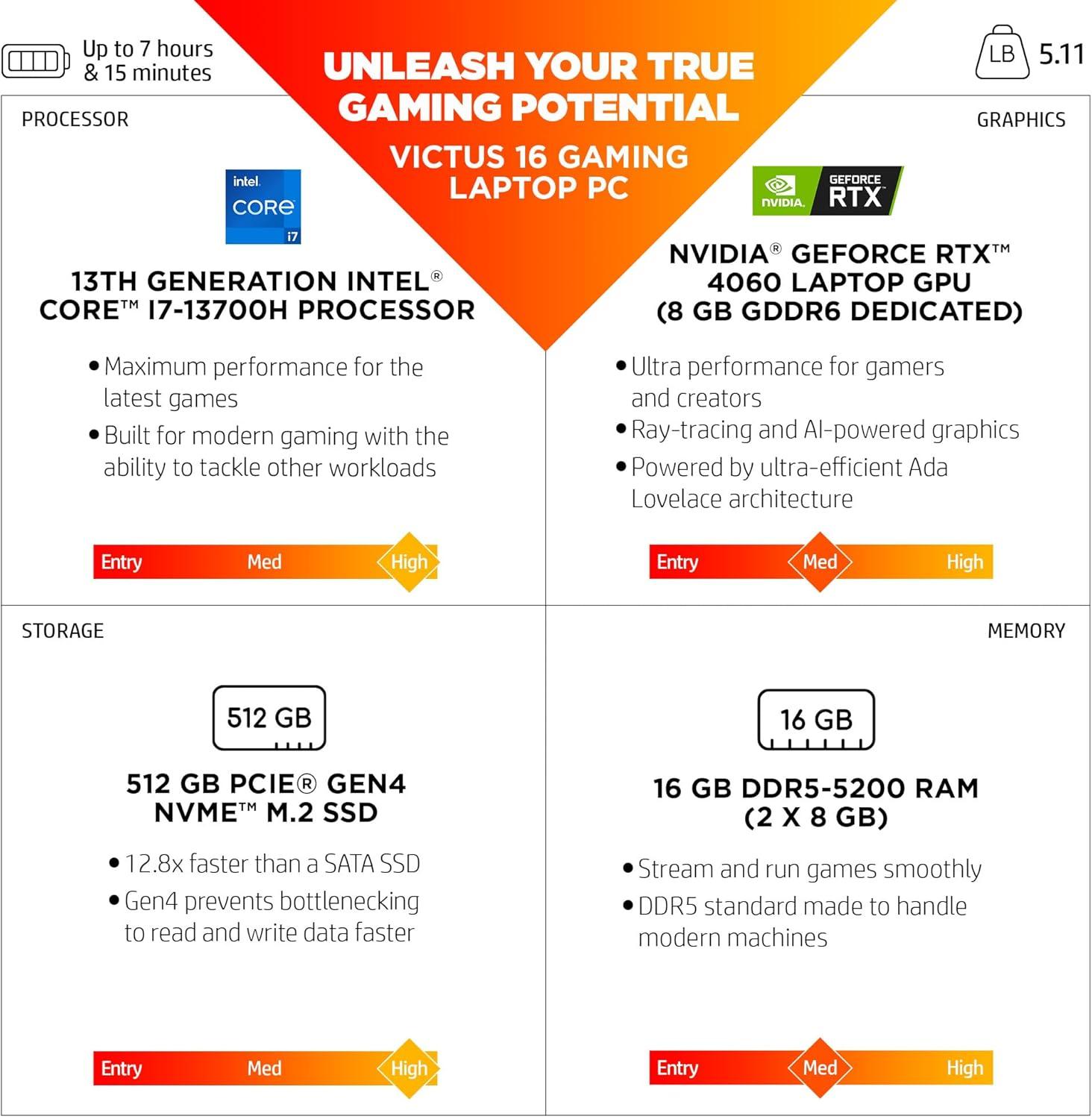 The HP Victus 16 Gaming Laptop unleashes your true potential with the power to turn your games to max settings and live your best uninhibited gaming life. With the firepower of the 13th Generation Intel Core i7-13700H processor and new NVIDIA GeForce RTX GPU, you can see the game the way it's meant to be played. It's not all about what’s under the hood, but with our optimization software, OMEN Gaming Hub, everything under the hood is that much better. Look at the computer you’re currently using and ask yourself this question: Does this PC really represent who I am as a gamer? If your answer is no, my perfect PC has a crisp high refresh rate screen with an immersive micro-edge bevel while still being super affordable, congratulations! The new HP Victus 16 was made just for you. HP Fast Charge goes from 0 to 50% charge in approximately 30 minutes. The HP Victus 16 comes with a 230 W Smart AC power adapter. Plus, made with the planet in mind, this HP notebook is EPEAT Gold registered and ENERGY STAR certified. HP is here to help. This HP computer comes with 1-year limited hardware warranty and 1-year limited technical support for software and initial setup with 24-hour, 7 days a week web support when shipped from and sold by Amazon.com. 1 month trial offer – Promotional offers may be for new members only and/or not be valid for all members and are only available for a limited time. Credit card and Xbox account required. After promotional period, subscription automatically continues at the then current regular price (subject to change), unless cancelled, plus applicable taxes. To stop being charged, cancel your subscription or turn off recurring billing in your Microsoft account (account.microsoft.com/services) or on your Xbox console, before the next billing date. For more details, see support.xbox.com/help/subscriptions-billing/manage-subscriptions/cancel-recurring-billing-or-subscription. Purchase of Xbox Game Pass Ultimate automatically upgrades your existing Xbox Live Gold, Xbox Game Pass (PC or Console), and/or EA Play membership(s) to Xbox Game Pass Ultimate at a conversion ratio each based on days remaining. Learn how this works at xbox.com/gamepass. See Microsoft xbox.com/en-US/legal/subscription-terms for more details.