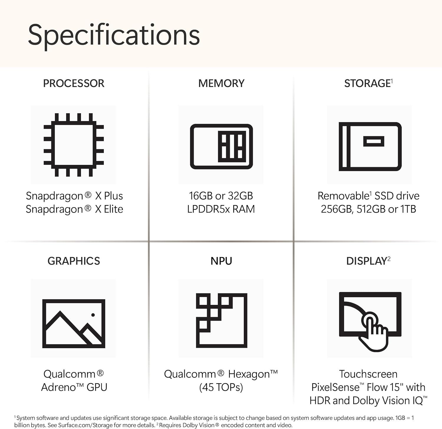 * Some Copilot+ PCs require download of free updates to run Copilot+ PC experiences, available starting late 2024 – 2025. See aka.ms/copilotpluspcs ** Pre-release screen shown; subject to change. *** Availability of Copilot+ PC features varies by device and market. [1] Based on Cinebench 2024 Multi-threaded conducted by Microsoft in April 2024 comparing pre-release build of Surface Laptop 13.8″ and 15” with Snapdragon X Elite running pre-release Windows 11 26100 and Apple MacBook Air 13.6″ and 15” with M3 running macOS 14 Sonoma. [2] Optimized for select languages (English, Chinese (simplified), French, German, Japanese, and Spanish. Content-based and storage limitations apply. Recall is coming soon through a post-launch Windows Update. See https://aka.ms/copilotpluspcs. [3] Colors available on selected models only. Available colors, sizes, finishes, and processors may vary by store, market, and configuration. [4] Surface Laptop, excluding power supply, contains a minimum of 25% recycled content. Based on validation performed by Underwriter Laboratories, Inc. using Environmental Claim Validation Procedure for Recycled Content, UL 2809-2, Second Edition, November 7, 2023.  [5] Currently supports translation for video and audio subtitles into English from 40+ languages. See https://aka.ms/copilotpluspcs. [6] Battery life varies significantly based on device configuration, usage, network and feature configuration, signal strength, settings and other factors. See aka.ms/SurfaceBatteryPerformance for details. [7] 13.8″ Surface Laptop comes with 39 W Surface power supply. Fast charging (from 5% to 80%) is supported with minimum 65W Surface power supply or USB-C® PD charger, sold separately. Testing was conducted at Microsoft in February 2024, using pre-production devices, software, and minimum of 65W USB-C® charger under controlled conditions. The device was powered on to the desktop screen with default display brightness settings. Actual charge time will vary based on operating conditions. Measured at typical office ambient temperature of 23C.   [8] Enclosure includes A Cover, C Bucket and D Cover. 100% recycled aluminum alloy in A Cover and C Bucket. 100% recycled rare earth metals in magnets. Based on validation performed by Underwriter Laboratories, Inc. using Environmental Claim Validation Procedure (ECVP) for Recycled Content, UL 2809-2, Second Edition, November 7, 2023.  [9] Enclosure includes A Cover, C Bucket and D Cover. Based on validation performed by Underwriter Laboratories, Inc. using Environmental Claim Validation Procedure for Recycled Content, UL 2809-2, Second Edition, November 7, 2023. [10] Available colors may vary by market. [11] USB-C® port does not charge your Surface device or any device that requires more than 15W [12] Requires device with USB-C® USB4®/Thunderbolt™ 4 port and when supported by device and display. *Screens simulated; subject to change *Recall: Optimized for select languages (English, Chinese (simplified), French, German, Japanese, and Spanish.) Content-based and storage limitations apply. See [https://aka.ms/copilotpluspcs]. *Cocreator: Optimized for English text prompts See [https://aka.ms/copilotpluspcs]