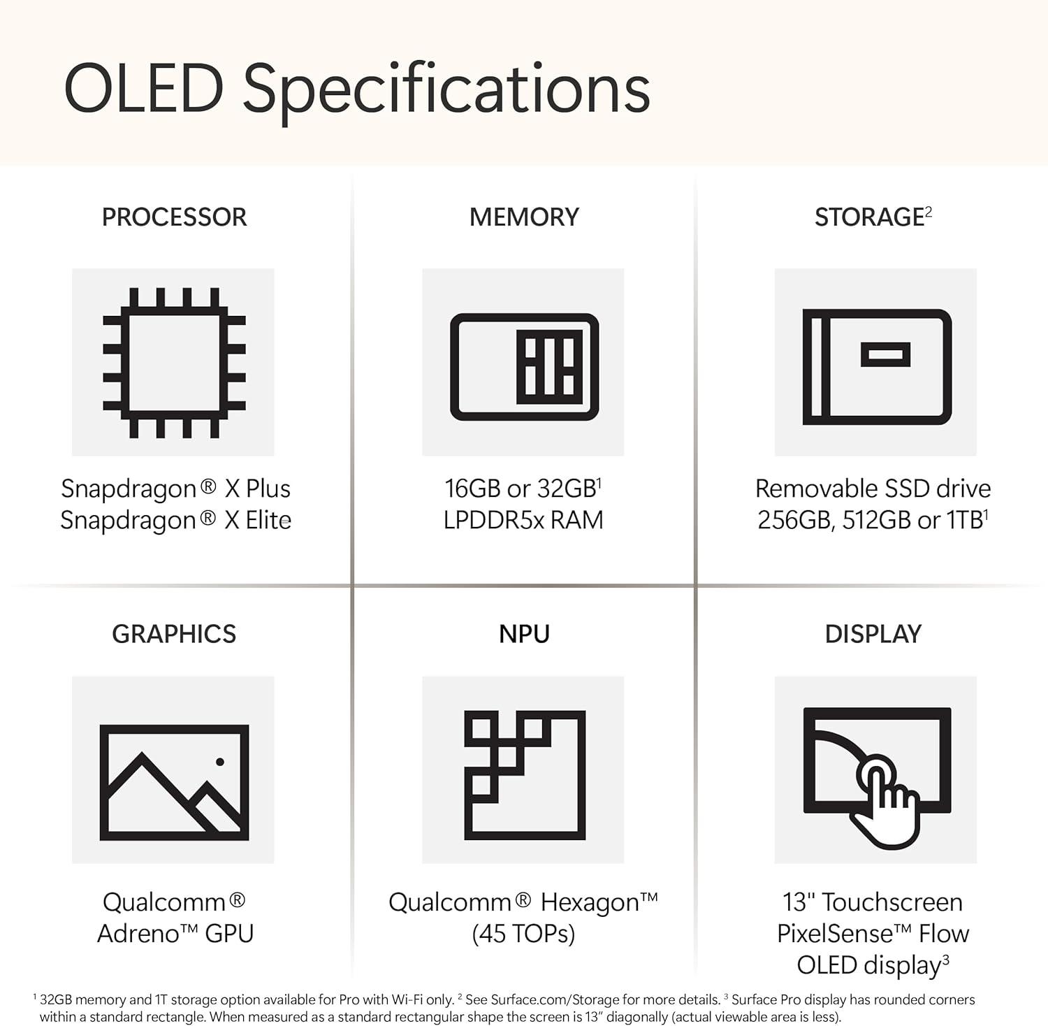* Some Copilot+ PCs require download of free updates to run Copilot+ PC experiences, available starting late 2024 – 2025. See https://aka.ms/copilotpluspcs ** Pre-release screen shown; subject to change. *** Availability of Copilot+ PC features varies by device and market. [1] Based on Cinebench 2024 Multi-threaded conducted by Microsoft in April 2024 comparing pre-release build of Surface Torrance with Snapdragon X Elite running pre-release Windows 11 26100 and Apple MacBook Air 13″ with M3 running macOS 14 Sonoma. [2] Optimized for select languages (English, Chinese (simplified), French, German, Japanese, and Spanish. Content-based and storage limitations apply. See https://aka.ms/copilotpluspcs [3] 6GHz band not available in all regions. [4] Options with 5G coming later in 2024. 5G not available in all areas; compatibility and performance depends on carrier network, plan and other factors. See carrier for details and pricing. [5] Battery life varies significantly based on usage, network and feature configuration, signal strength, settings, and other factors. See https://aka.ms/SurfaceBatteryPerformance for details. [6] In select markets, only specific configurations come with 39W Surface power supply. Fast charging is supported with minimum 65W Surface power supply or USB Type-C PD charger rated at 60W or higher, sold separately. Testing conducted by Microsoft in March 2024. For details on Fast Charging see – USB-C and Fast Charging for Surface – Microsoft Support [7] Currently supports translation for video and audio subtitles into English from 40+ languages. See https://aka.ms/copilotpluspcs [8] HDR requires HDR content and enabling HDR in device settings [9] Supporting 3 external displays requires either 2 displays connected to a compatible dock or connected through daisy chain. [10] Detached use requires Windows 11.