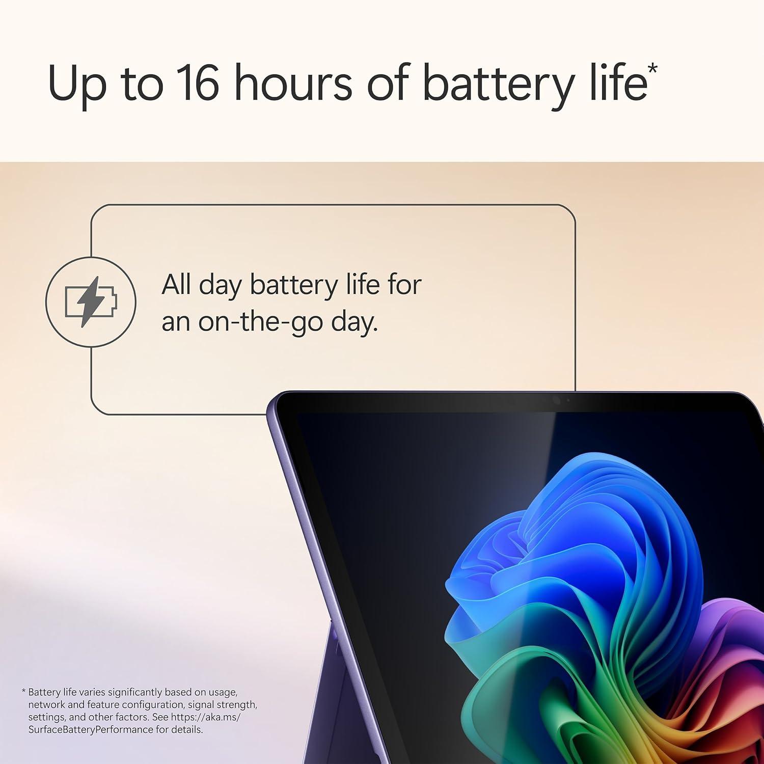 [1] Battery life varies significantly based on usage, network and feature configuration, signal strength, settings and other factors. See https://aka.ms/SurfaceBatteryPerformance for details. [2] Available colors may vary by market. [3] Accessories sold separately. [4] USB4® and USB-C® are registered trademarks of USB Implementers Forum. [5] On some devices, Copilot+ PC experiences require free updates available starting later this year and continuing into 2025. Timing varies by device and region – https://aka.ms/copilotpluspcs