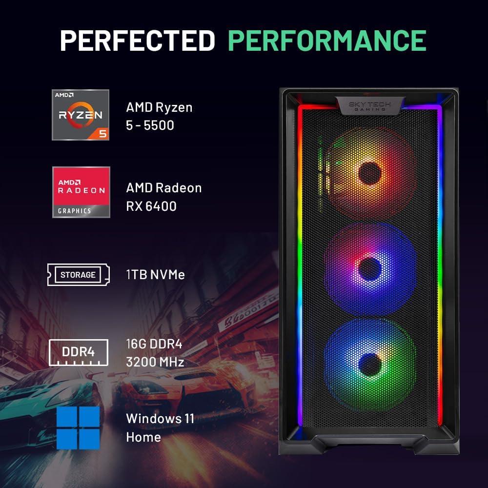 Skytech Gaming Nebula Gaming PC, AMD Ryzen 5 5500 3.6GHz, AMD RX 6500XT 8GB, 500GB NVMe SSD, 16GB DDR4 RAM 3200, 650W Gold PSU, Wi-Fi, Win 11, Gaming Desktop(5500 | RX 6400)